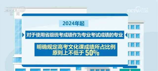 此外,2024年起,對于使用省級統(tǒng)考成績作為專業(yè)考試成績的專業(yè),明確規(guī)定高考文化課成績所占比例原則上不低于50%。同時,鼓勵??几咝=Y(jié)合專業(yè)培養(yǎng)要求,進(jìn)一步提高考生高考文化課成績錄取要求。
