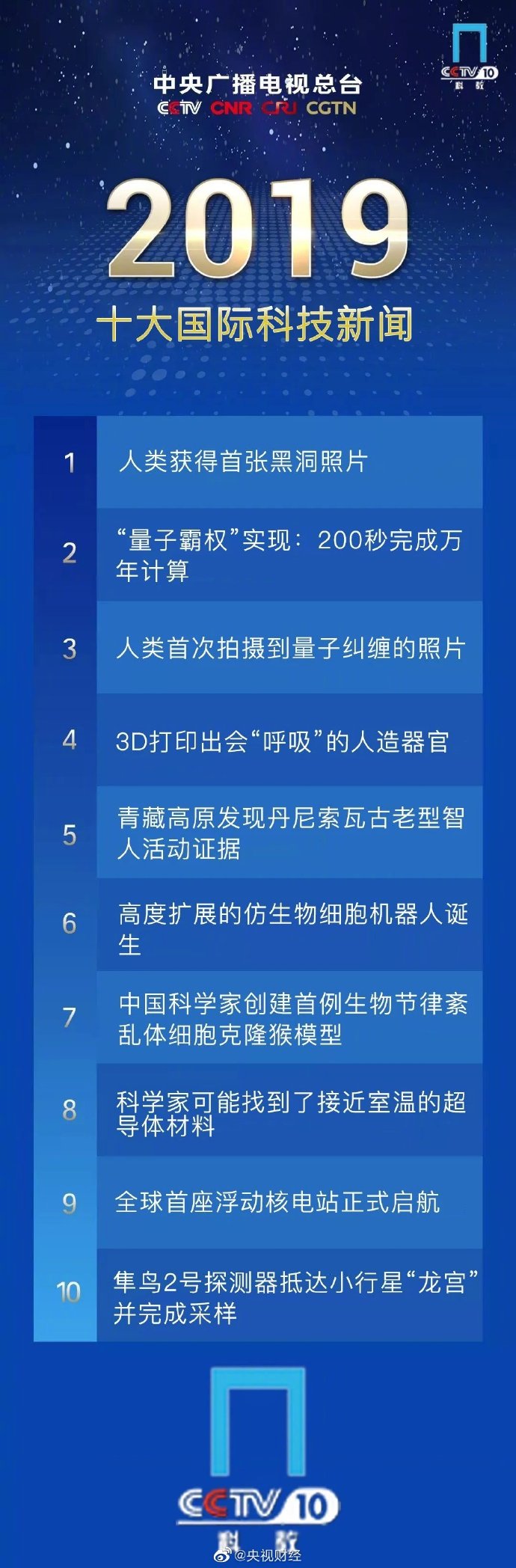 2019十大國際科技新聞包括:人類獲得首張黑洞照片、“量子霸權(quán)”實現(xiàn)200秒完成萬年計算、人類首次拍攝到量子糾纏的照片、3D打印出會“呼吸”的人造器官、青藏高原發(fā)現(xiàn)丹尼索瓦古老型智人活動證據(jù)、高度擴展的仿生物細胞機器人誕生、中國科學家創(chuàng)建首例生物節(jié)律紊亂體細胞克隆猴模型、科學家可能找到了接近室溫的超導體材料、全球首座浮動核電站正式啟航、隼鳥2號探測器抵達小行星“龍宮”并完成采樣。