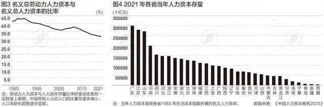 此外,從1985至2021年間受教育程度人群所在的人力資本與人力資本存量比率變化情況,也可以看到人口年齡結(jié)構(gòu)的變化。