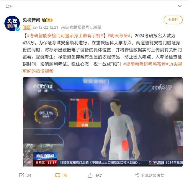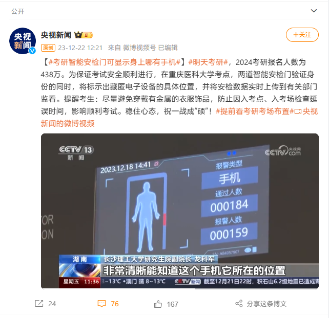多地考研入場新增智能安檢門:可標(biāo)示藏匿電子設(shè)備具體位置,并實時上傳數(shù)據(jù)