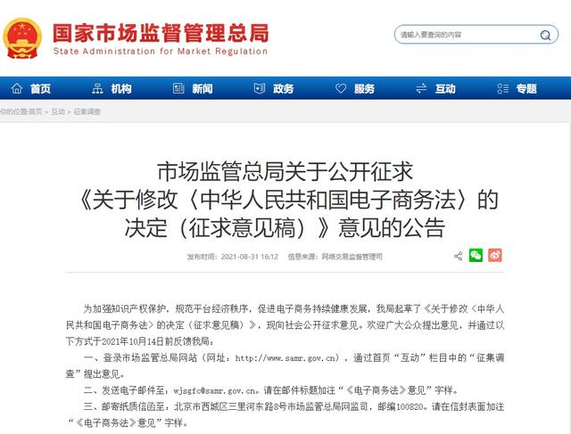 8月31日,市場監(jiān)管總局發(fā)布公告,針對(duì)《關(guān)于修改〈中華人民共和國電子商務(wù)法〉的決定(征求意見稿)》向社會(huì)公開征求意見。市場監(jiān)管總局表示 ...