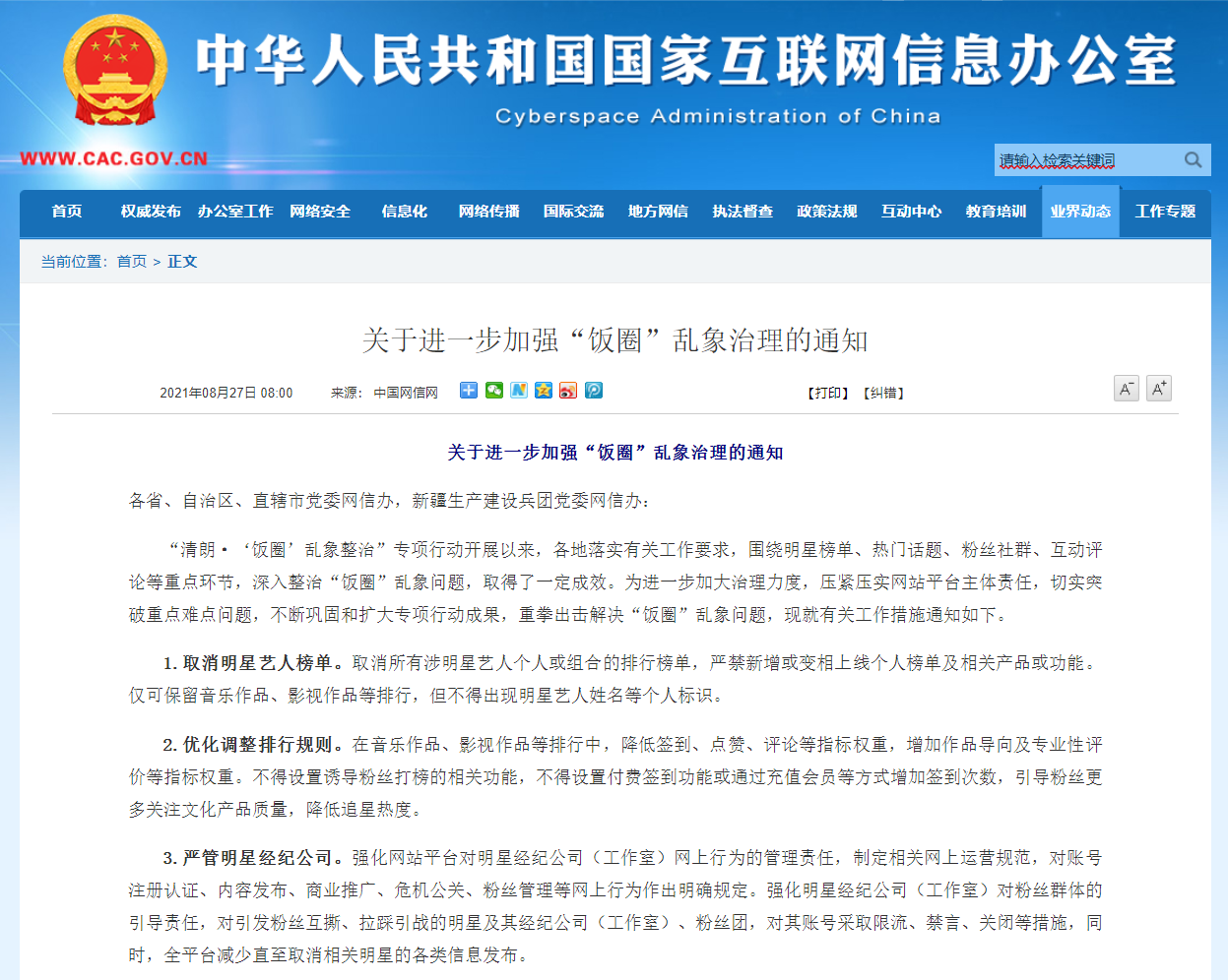 網(wǎng)信辦整治飯圈亂象:取消明星藝人榜單/優(yōu)化調(diào)整排行規(guī)則/嚴禁呈現(xiàn)互撕信息