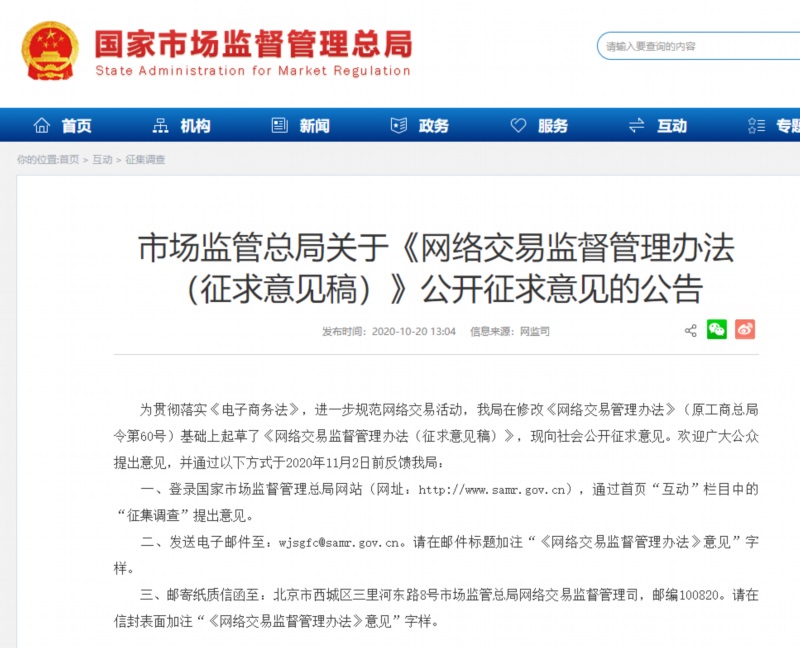 近日,國(guó)家市場(chǎng)監(jiān)管總局公布了《網(wǎng)絡(luò)交易監(jiān)督管理辦法(征求意見(jiàn)稿)》,進(jìn)一步規(guī)范網(wǎng)絡(luò)交易活動(dòng),將網(wǎng)絡(luò)直播帶貨等網(wǎng)絡(luò)交易新業(yè)態(tài)納入監(jiān)管范 ...