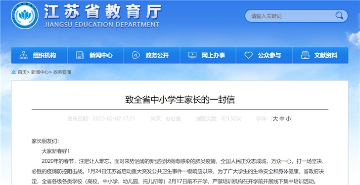 日前,江蘇省政府決定,全省各級(jí)各類學(xué)校(高校、中小學(xué)、幼兒園、托兒所等)2月17日前不開學(xué),嚴(yán)禁培訓(xùn)機(jī)構(gòu)在開學(xué)前開展線下集中培訓(xùn)活動(dòng)。 ...