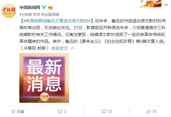 今天,教育部召開新聞發(fā)布會,介紹了普通高中三科統(tǒng)編教材有關工作情況。魯迅的作品退出語文教材的傳言引發(fā)了輿論關注,而教育部對此進行了 ...
