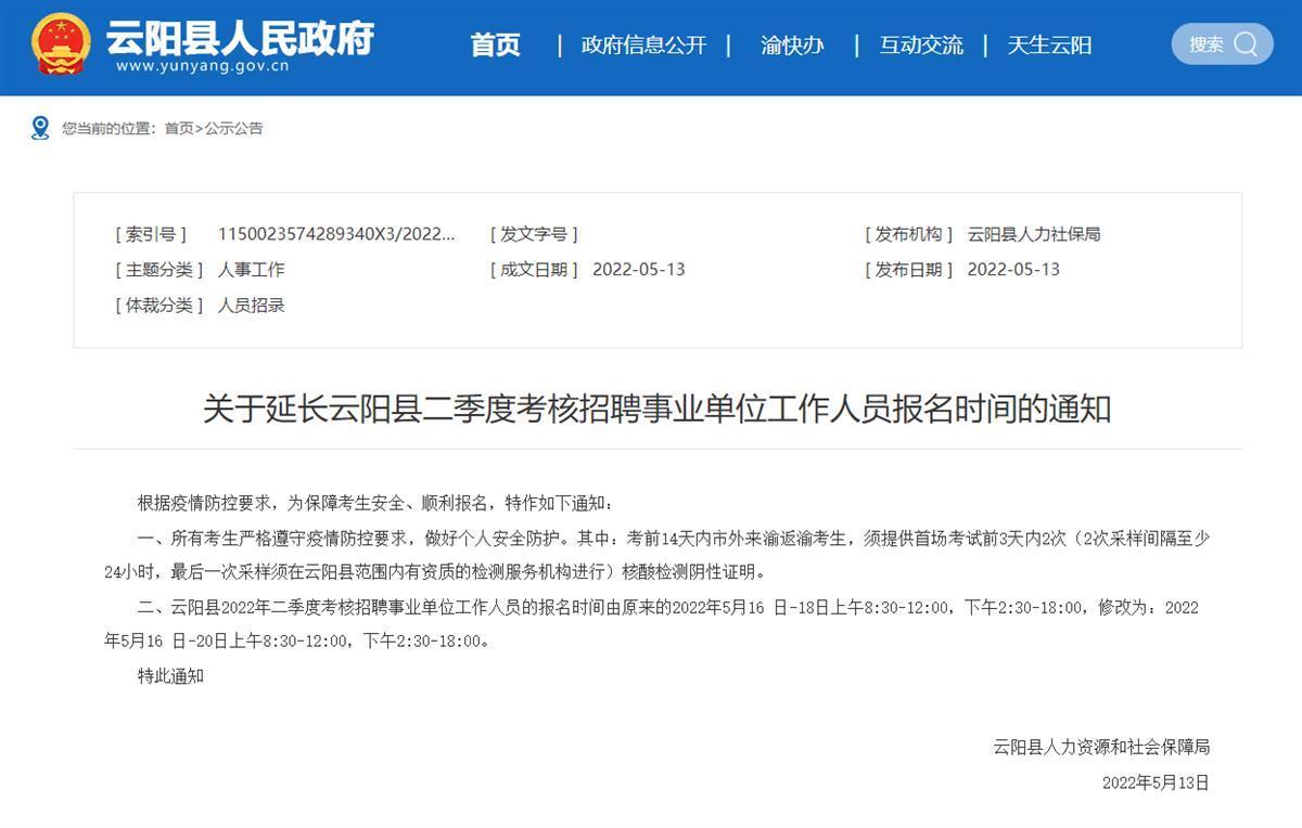 近日,重慶云陽(yáng)縣發(fā)布2022年二季度考核招聘事業(yè)單位工作人員公告,引起大量網(wǎng)友關(guān)注。極目新聞?dòng)浾咦⒁獾?,本次招聘工作人員190名,其中176 ...