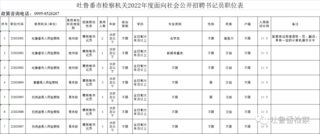 6.招聘崗位、人數(shù)其他具體要求詳見(jiàn)《2022年吐魯番市人民檢察院面向社會(huì)公開(kāi)招聘聘用制書記員職位表》。