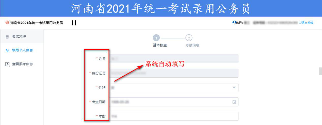 1.姓名、身份證號、性別、出生日期、年齡等信息為系統(tǒng)自動填寫。