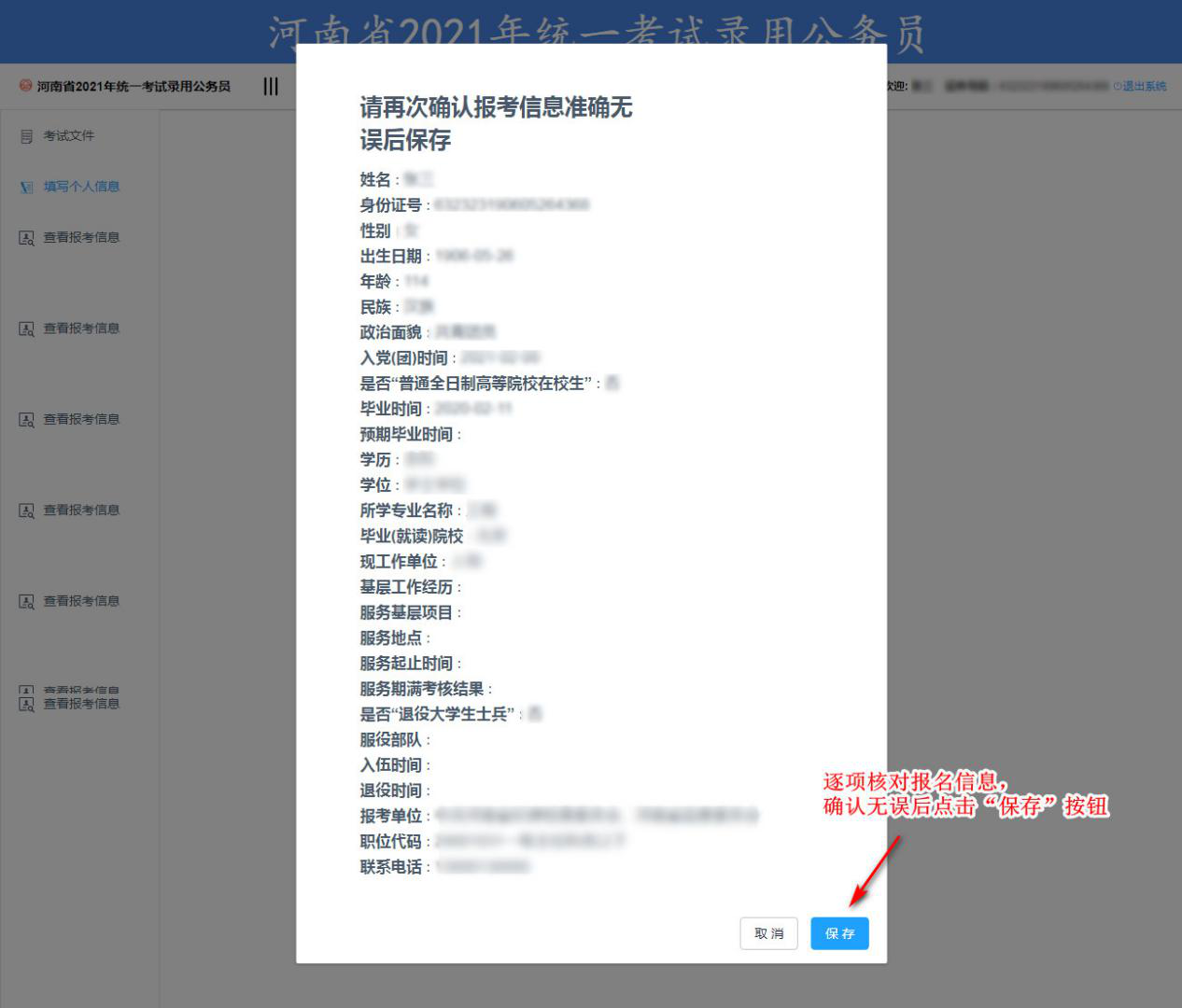 逐項核對報名信息,確認(rèn)無誤后點(diǎn)擊“保存”按鈕,彈出如下頁面,至此保存成功。