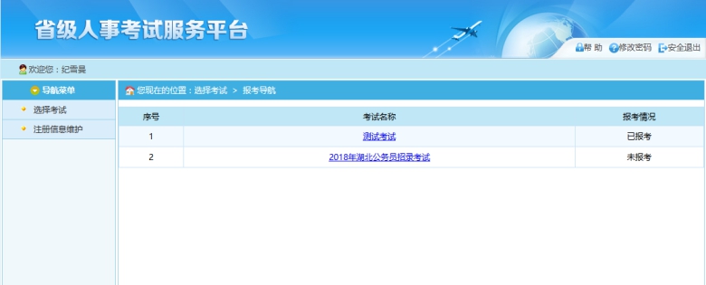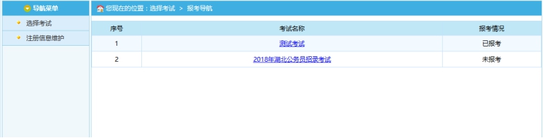 通過點擊系統(tǒng)導(dǎo)航菜單中“選擇考試”選項可以跳轉(zhuǎn)到選擇要報名的考試的頁面,如下圖所示: