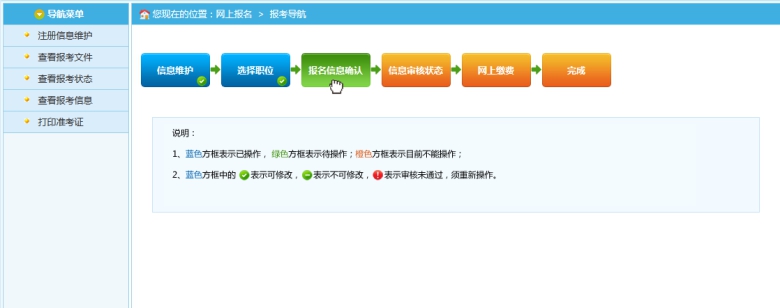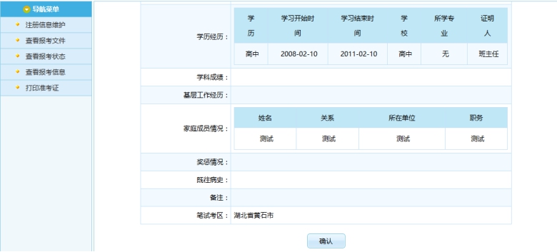 通過點擊“報名信息確認”按鈕后,跳轉(zhuǎn)到報名信息確認頁面,如下圖所示: