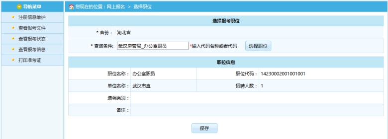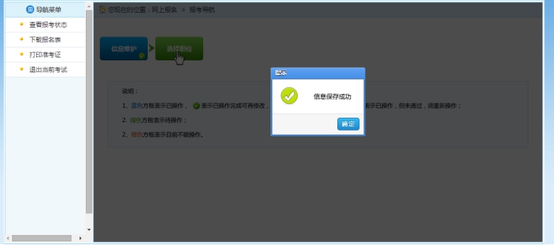 選擇相應(yīng)的職位,點擊“保存”按鈕,提示保存成功,可以跳轉(zhuǎn)到報考流程頁面,如下圖所示: