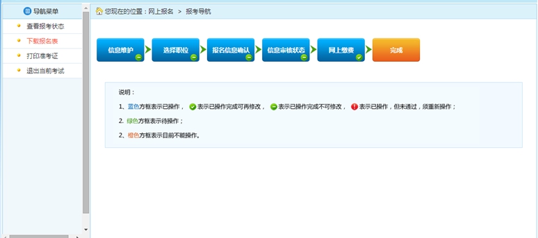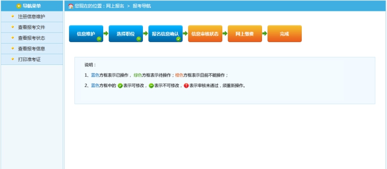 通過點擊系統(tǒng)導(dǎo)航菜單的“查看報考狀態(tài)”選項,可進入查看狀態(tài)頁面,查看職位審核狀態(tài),確定報考情況和審核進度,以免延誤報考。如下圖所示: