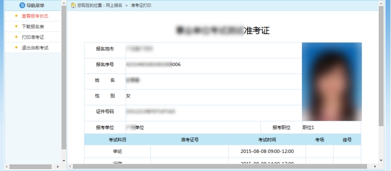 通過點擊系統(tǒng)導(dǎo)航菜單的“打印準考證”選項,可進入準考證打印頁面,如下圖所示: