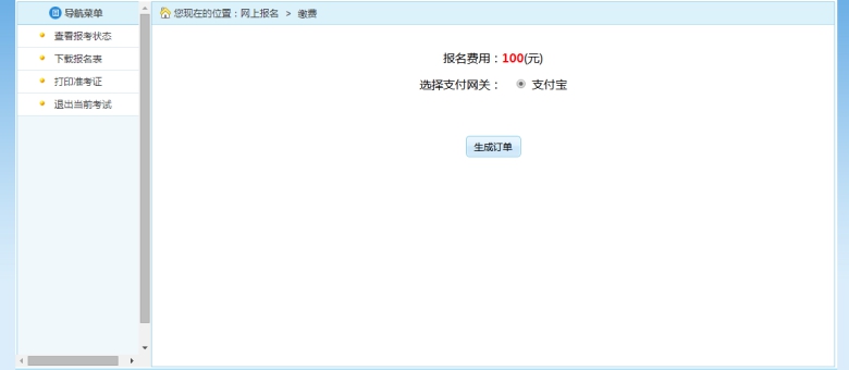 審核通過的考生可以進行網(wǎng)上繳費,點擊報考流程中“網(wǎng)上繳費”選項,可以進入網(wǎng)上繳費的頁面,如下圖所示: