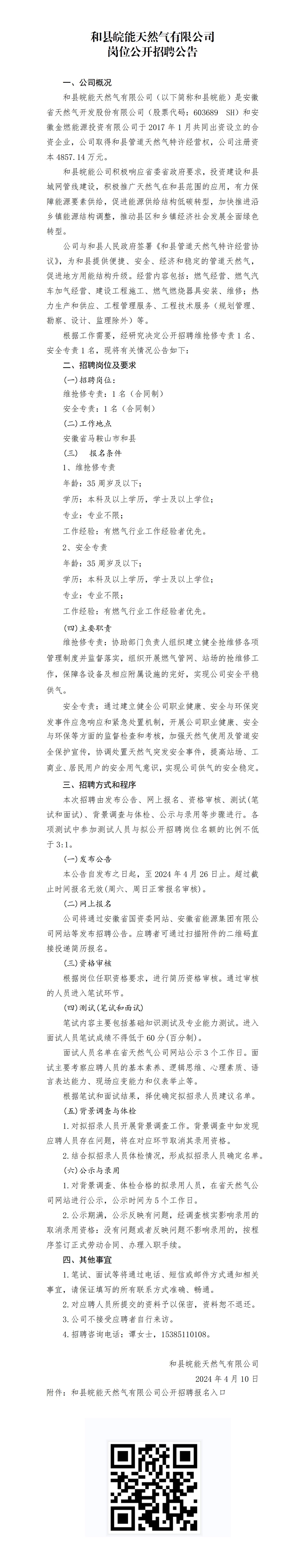 2024年馬鞍山和縣皖能天然氣有限公司崗位公開(kāi)招聘公告