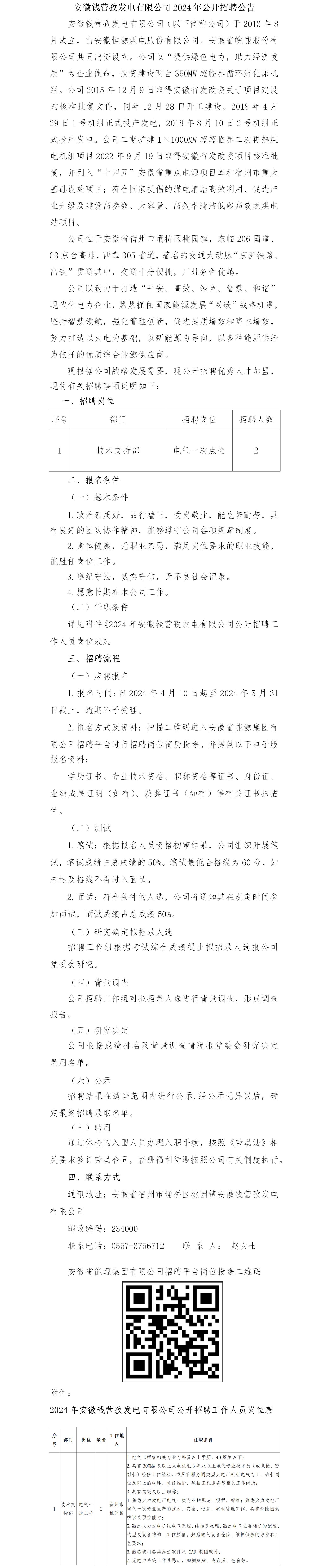 2024年宿州安徽錢營孜發(fā)電有限公司公開招聘公告