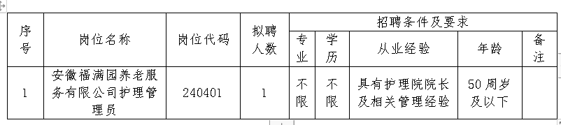 2024-05-13 11:31:42閱讀()安徽省盛岳保安服務集團有限公司安徽省岳順人力資源服務有限公司是岳西縣縣屬一級國有企業(yè)盛岳集團旗下的全資子公司。我公司充分了解客戶的行業(yè)特點、組織架構、人才需求、員工培訓等方面的需求,致力于為客戶提供定制化的人力資源服務方案,包括人才招聘、員工培訓、勞務派遣、勞務外包等,旨在幫助客戶解決人力資源問題,提高組織效率,降低運營成本。盛岳·安徽福滿園養(yǎng)老服務有限公司委托我公司面向社會公開招聘工作人員,現將相關事項公告如下: