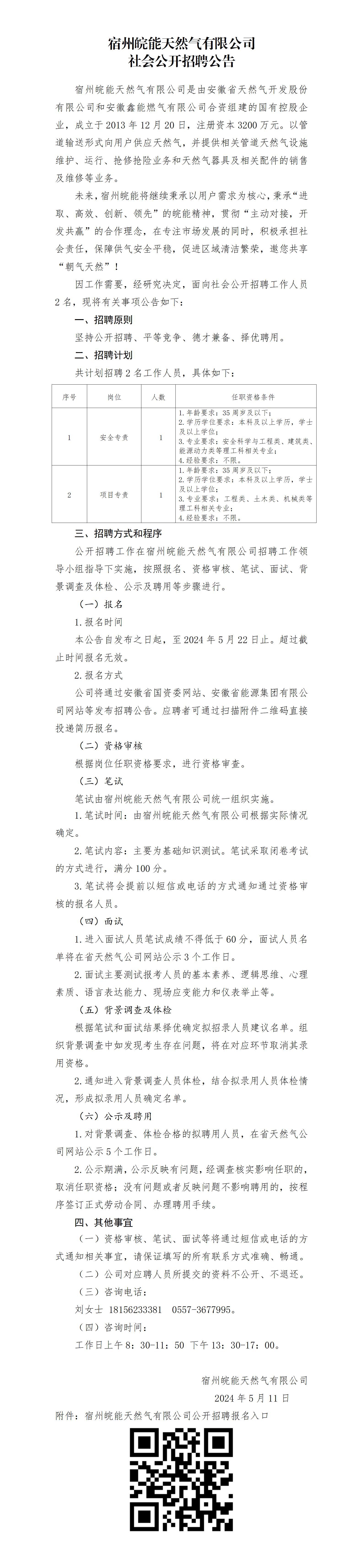 2024年宿州皖能天然氣有限公司社會(huì)公開招聘公告
