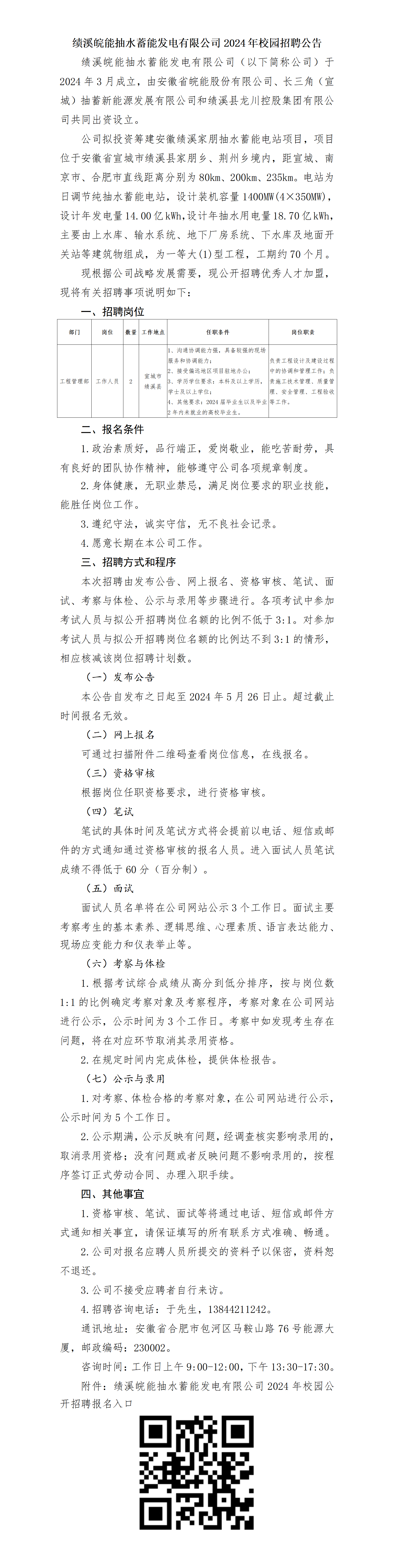 2024年宣城績(jī)溪皖能抽水蓄能發(fā)電有限公司校園招聘公告
