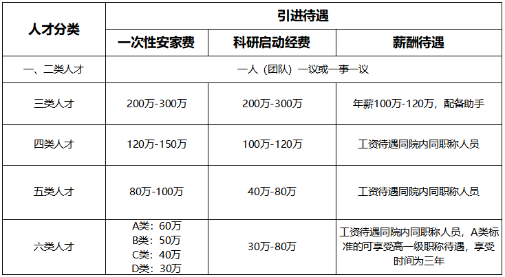 積極鼓勵(lì)引進(jìn)人才團(tuán)隊(duì),實(shí)行“一事一策”,團(tuán)隊(duì)成員按同層次人才上浮 10% 享受待遇;團(tuán)隊(duì)科研啟動(dòng)經(jīng)費(fèi)300-600 萬(wàn)元?;虬凑?qǐng)F(tuán)隊(duì)人才類型對(duì)應(yīng)的科研啟動(dòng)經(jīng)費(fèi)累計(jì)計(jì)發(fā)。