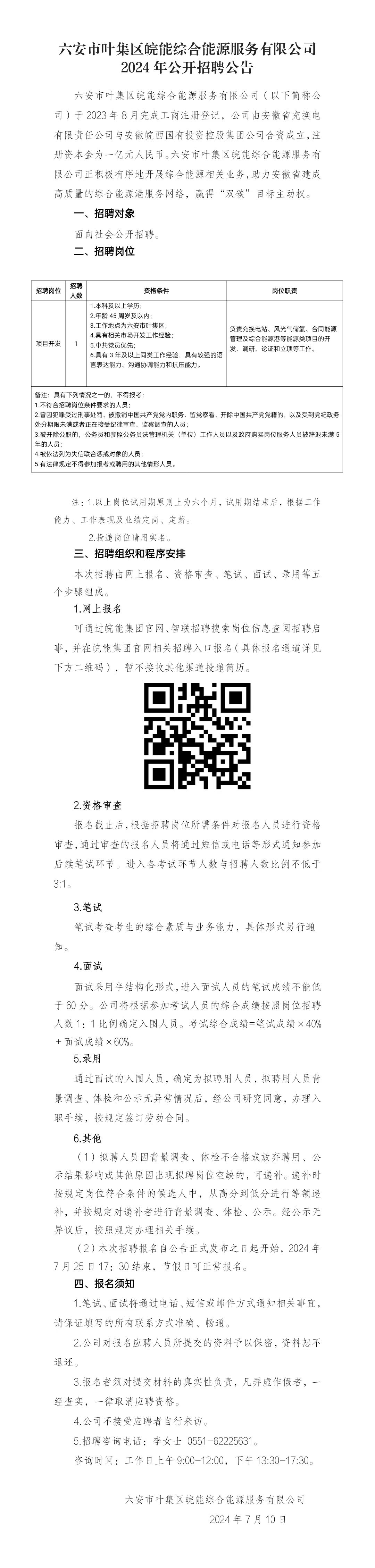 2024年六安市葉集區(qū)皖能綜合能源服務(wù)有限公司公開(kāi)招聘公告