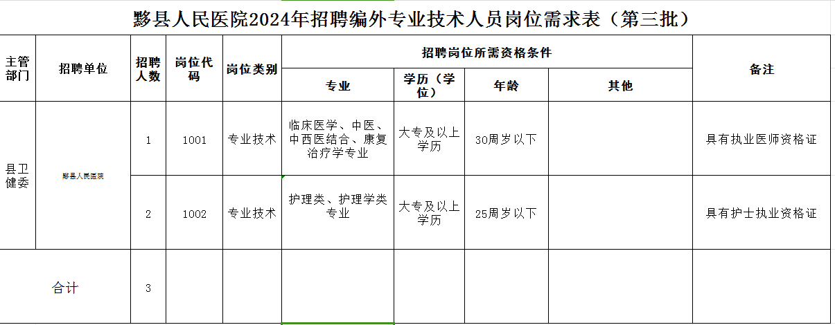 本次招聘共計(jì)2個(gè)崗位3名專(zhuān)業(yè)技術(shù)人員。詳見(jiàn)《黟縣人民醫(yī)院2024年招聘編外專(zhuān)業(yè)技術(shù)人員崗位需求表(第三批)》