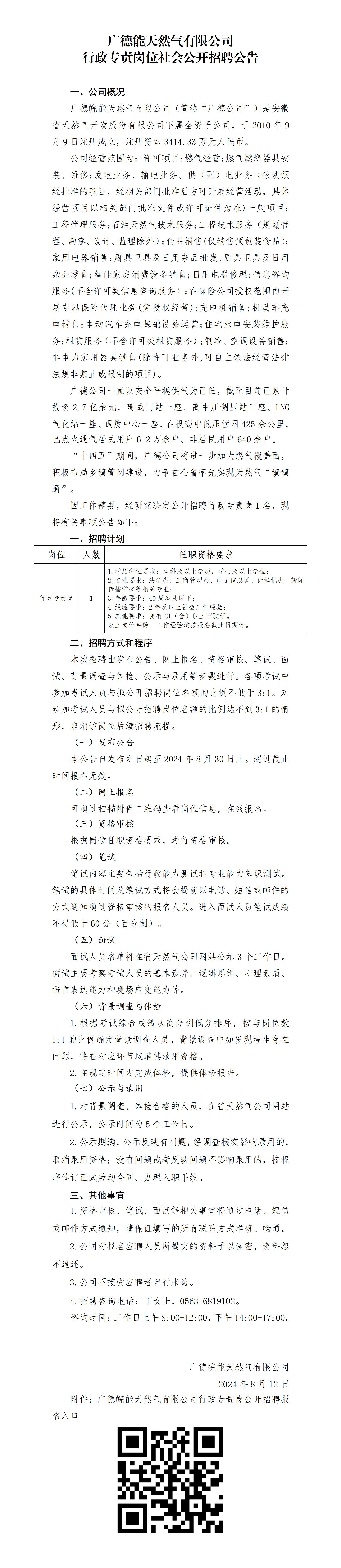 2024年宣城廣德皖能天然氣有限公司行政專責(zé)崗位社會(huì)公開招聘公告