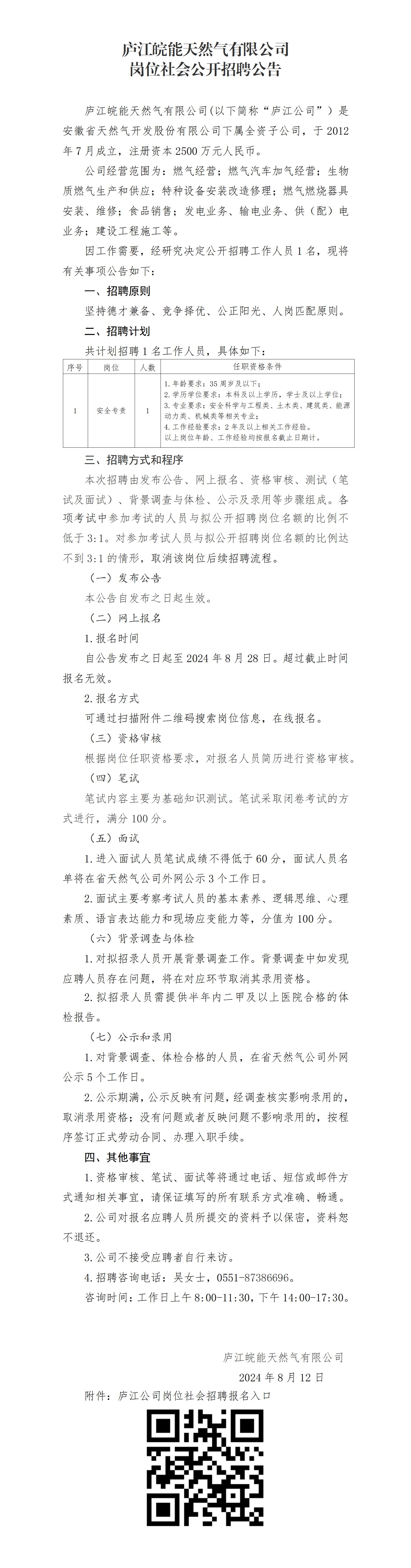 2024年合肥廬江皖能天然氣有限公司崗位社會(huì)公開招聘公告