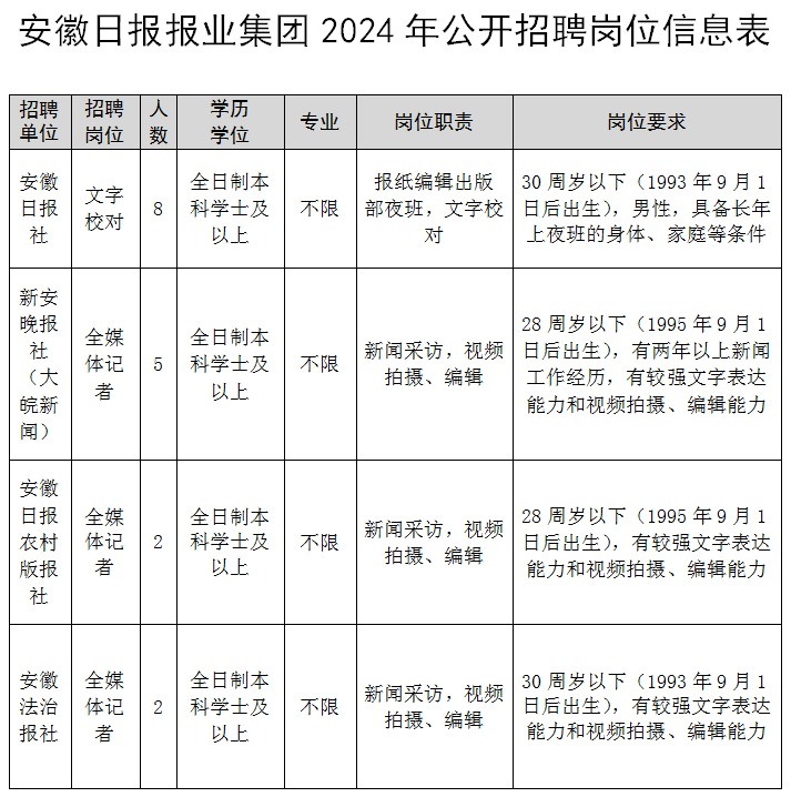 詳見《安徽日?qǐng)?bào)報(bào)業(yè)集團(tuán)2024年公開招聘崗位信息表》。