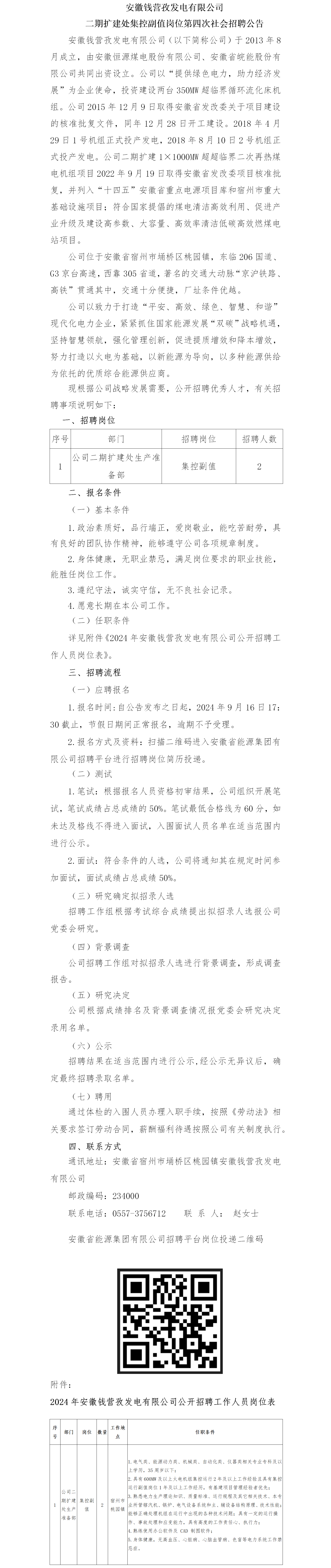 2024年宿州安徽錢營孜發(fā)電有限公司二期擴建處集控副值崗位第四次社會招聘公告