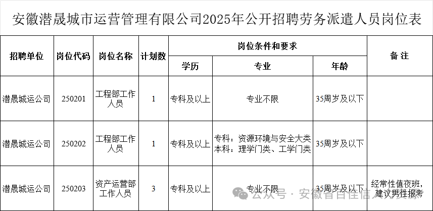 根據(jù)工作需要,安徽潛晟城市運(yùn)營(yíng)管理有限公司委托安徽省百佳信人力資源服務(wù)有限責(zé)任公司面向社會(huì)公開(kāi)招聘勞務(wù)派遣人員5名,聘用人員將通過(guò)勞務(wù)派遣方式在安徽潛晟城市運(yùn)營(yíng)管理有限公司工作,現(xiàn)就招聘工作有關(guān)事項(xiàng)公告如下:
