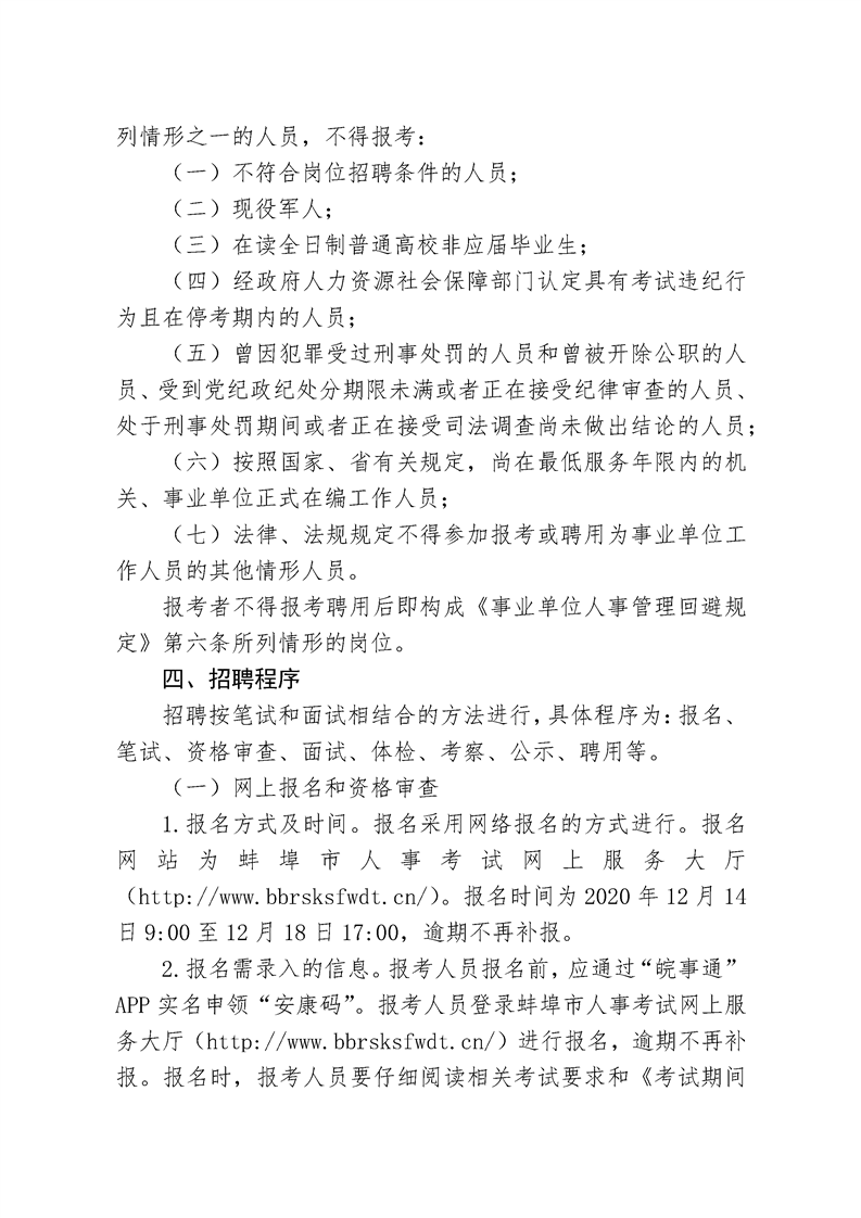 2.報(bào)名需錄入的信息。報(bào)考人員報(bào)名前,應(yīng)通過(guò)“皖事通”APP實(shí)名申領(lǐng)“安康碼”。報(bào)考人員登錄蚌埠市人事考試網(wǎng)上服務(wù)大廳(http://www.bbrsksfwdt.cn/)進(jìn)行報(bào)名,逾期不再補(bǔ)報(bào)。報(bào)名時(shí),報(bào)考人員要仔細(xì)閱讀相關(guān)考試要求和《考試期間疫情防控須知》并簽訂誠(chéng)信承諾書(shū),提交的報(bào)考申請(qǐng)材料應(yīng)真實(shí)、準(zhǔn)確,所填信息必須真實(shí)無(wú)誤。對(duì)偽造、變?cè)煊嘘P(guān)證件、材料、信息,騙取考試資格的,將按照人事考試違紀(jì)違規(guī)的有關(guān)規(guī)定處理。凡因弄虛作假或雖通過(guò)資格審查但實(shí)際與報(bào)考條件規(guī)定不符的,一經(jīng)查實(shí),即取消考試、聘用等資格。每位報(bào)考人員限報(bào)一個(gè)崗位,并須使用同一有效居民身份證件報(bào)名和參加考試。招聘期間,考生須提供有效通訊方式,并確保聯(lián)絡(luò)暢通。