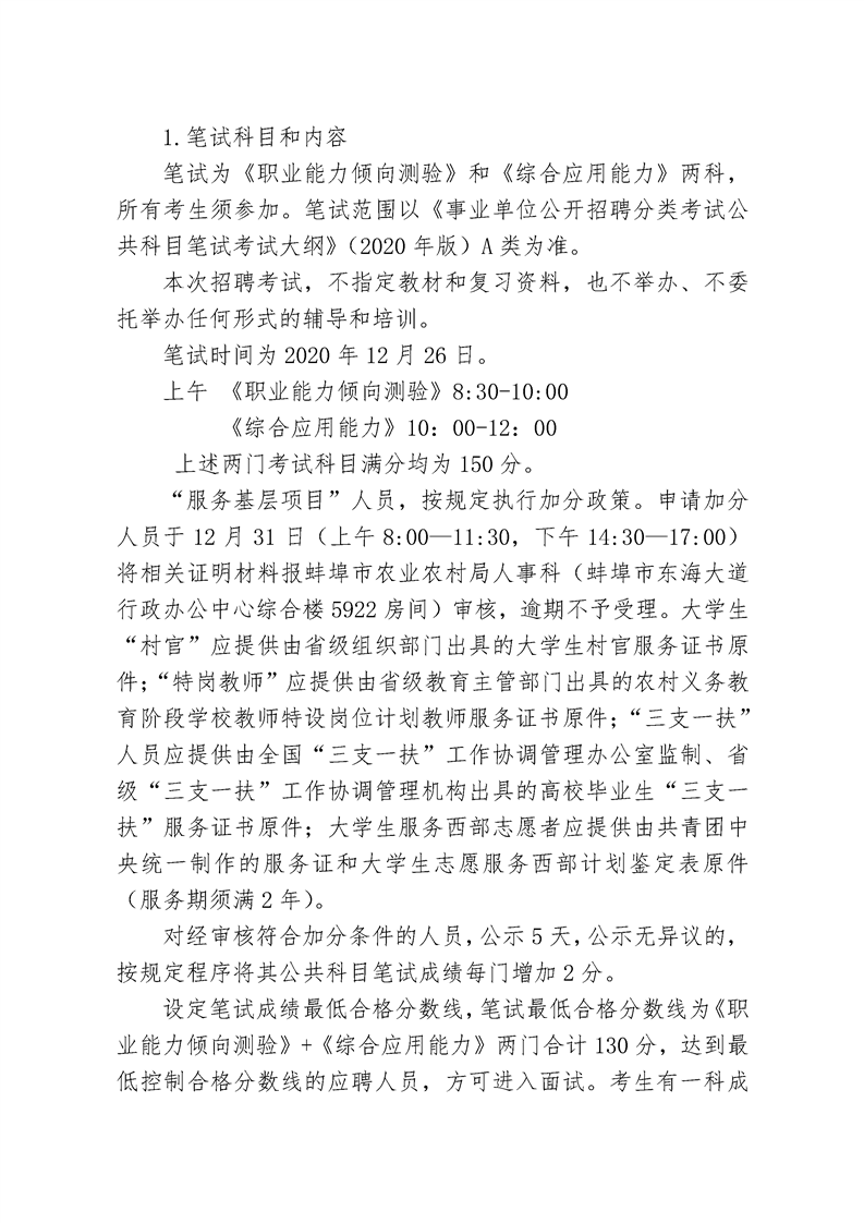 2020-12-01 23:37:34閱讀()蚌埠市人力資源和社會(huì)保障局根據(jù)《事業(yè)單位人事管理?xiàng)l例》(國(guó)務(wù)院令第652號(hào))和中共安徽省委組織部、安徽省人力資源和社會(huì)保障廳《關(guān)于印發(fā)<安徽省事業(yè)單位公開(kāi)招聘人員暫行辦法>的通知》(皖人社發(fā)〔2010〕78號(hào))和中共安徽省委組織部、安徽省人力資源和社會(huì)保障廳《關(guān)于貫徹落實(shí)應(yīng)對(duì)新冠肺炎疫情影響做好事業(yè)單位公開(kāi)招聘高校畢業(yè)生工作有關(guān)事項(xiàng)的通知》(皖人社秘〔2020〕73號(hào))規(guī)定,現(xiàn)就蚌埠市農(nóng)業(yè)農(nóng)村局所屬事業(yè)單位公開(kāi)招聘有關(guān)事項(xiàng)公告如下: