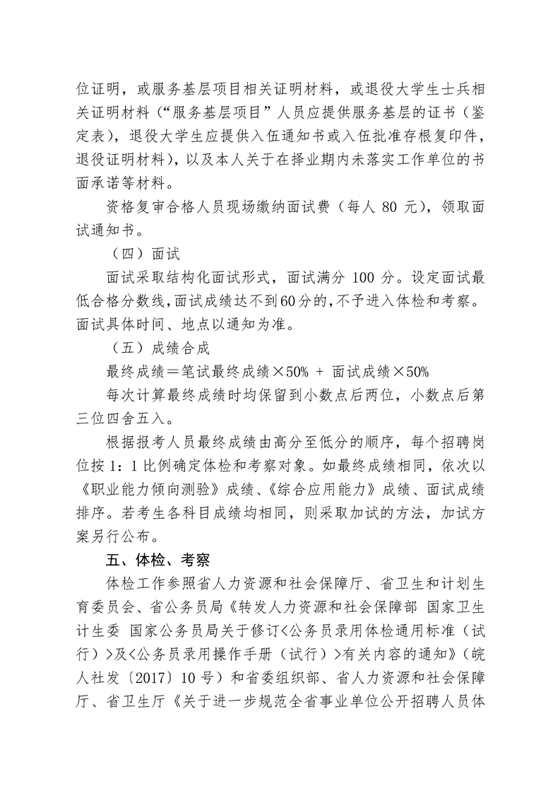 體檢工作參照省人力資源和社會(huì)保障廳、省衛(wèi)生和計(jì)劃生育委員會(huì)、省公務(wù)員局《轉(zhuǎn)發(fā)人力資源和社會(huì)保障部 國(guó)家衛(wèi)生計(jì)生委 國(guó)家公務(wù)員局關(guān)于修訂<公務(wù)員錄用體檢通用標(biāo)準(zhǔn)(試行)>及<公務(wù)員錄用操作手冊(cè)(試行)>有關(guān)內(nèi)容的通知》(皖人社發(fā)〔2017〕10號(hào))和省委組織部、省人力資源和社會(huì)保障廳、省衛(wèi)生廳《關(guān)于進(jìn)一步規(guī)范全省事業(yè)單位公開(kāi)招聘人員體檢工作的通知》(皖人社秘〔2013〕208號(hào))等規(guī)定執(zhí)行。體檢費(fèi)用由報(bào)考人員自理。
