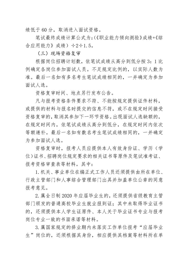 凡與報(bào)考資格條件要求不符、不能按規(guī)定提供證件材料,或提供的材料與報(bào)名時(shí)提交的信息不符,或不在規(guī)定時(shí)間接受資格復(fù)審的,取消其參加下一環(huán)節(jié)資格。出現(xiàn)面試人選缺額的,在規(guī)定時(shí)間內(nèi),依筆試成績(jī)從高分到低分,在規(guī)定時(shí)間內(nèi)依次等額遞補(bǔ)。最后一名如有數(shù)名考生筆試成績(jī)相同的,一并確定為參加面試人選。