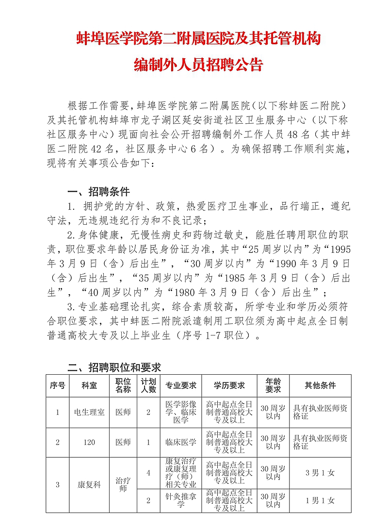 2020年蚌埠醫(yī)學(xué)院第二附屬醫(yī)院及其托管機構(gòu)編制外人員招聘公告