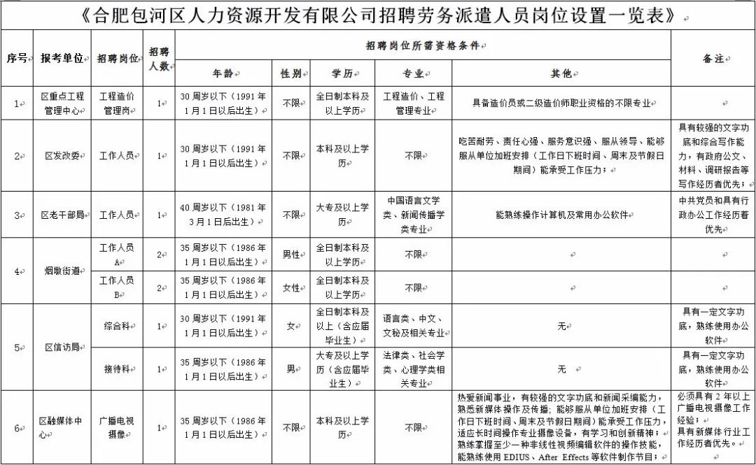 招聘崗位及要求見附件《合肥包河區(qū)人力資源開發(fā)有限公司招聘勞務派遣人員崗位設置一覽表》