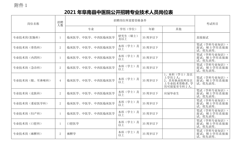 附件1:《2021年阜南縣中醫(yī)院公開招聘專業(yè)技術(shù)人員崗位表》