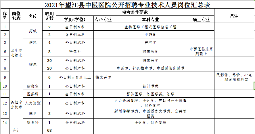 招聘崗位計劃數(shù)68個,具體招聘專業(yè)、人數(shù)、資格條件等見《2021年望江縣中醫(yī)醫(yī)院公開招聘專業(yè)技術人員崗位表》(附件1)。