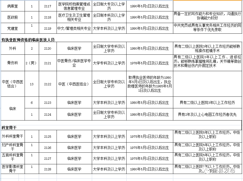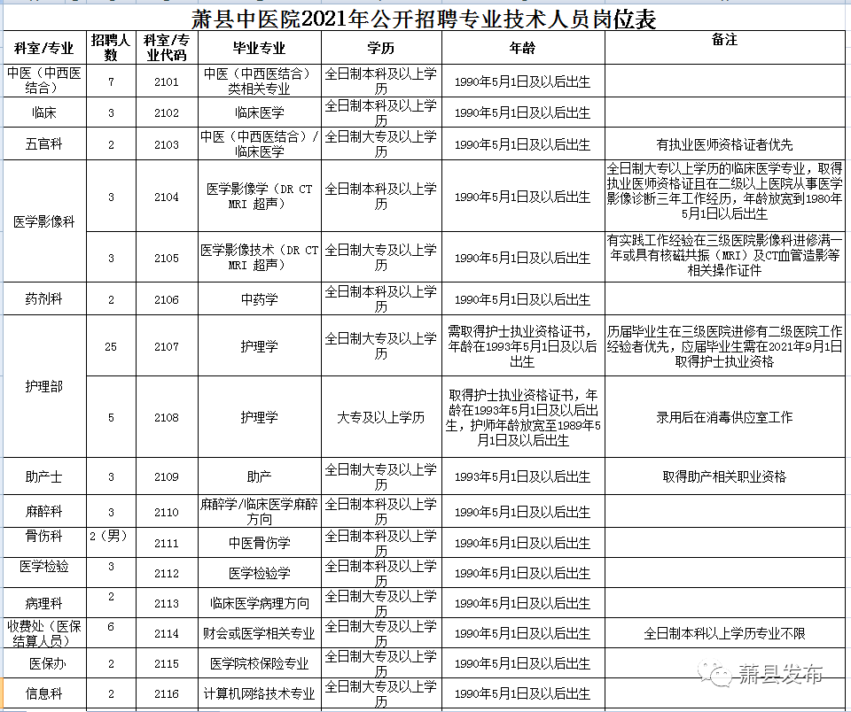 蕭縣中醫(yī)院,二級甲等中醫(yī)院,醫(yī)院設(shè)有內(nèi)科、外科、針推科、骨傷科、口腔科、婦科、肛腸科、檢驗科、影像科等臨床醫(yī)技科室,2021年新院投入使用,增設(shè)急診科、兒科、婦產(chǎn)科、五官科、腦病科、老年病、治未病等專業(yè)科室,努力打造糖尿病治療中心、康復(fù)治療中心、腫瘤治療中心、血透中心、中醫(yī)傳統(tǒng)療法中心等特色優(yōu)勢臨床基地,增加核磁共振、DSA等各種大型高端醫(yī)療設(shè)備。為滿足全縣人民的就醫(yī)需求和醫(yī)院發(fā)展需要,經(jīng)研究決定面向社會公開招聘合同制專業(yè)技術(shù)人員104名。