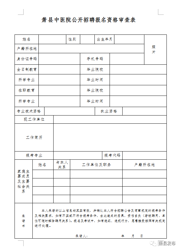 3、資格審查:報名的同時進(jìn)行資格審查,提供本人身份證、畢業(yè)證(應(yīng)屆生提供就業(yè)推薦表)、學(xué)歷證書電子注冊備案表(學(xué)信網(wǎng)打印)、學(xué)士證、執(zhí)業(yè)資格證、專業(yè)技術(shù)資格證等材料,上述證件和證明材料均要求提供原件和復(fù)印件及小2寸近期免冠正面彩色照片4張,填寫《蕭縣中醫(yī)院公開招聘人員報名表》(表格自行下載打印),每人只能選擇一個崗位報考。