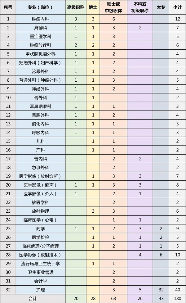 在中科院和安徽省暨合肥市的大力支持下,一所1500張床位的高水平、現(xiàn)代化三級(jí)甲等腫瘤專科醫(yī)院(高新院區(qū))正在建設(shè)中,根據(jù)醫(yī)院發(fā)展規(guī)劃,現(xiàn)面向全社會(huì)公開招聘各類專業(yè)技術(shù)人才,2020年人才招聘計(jì)劃如下: