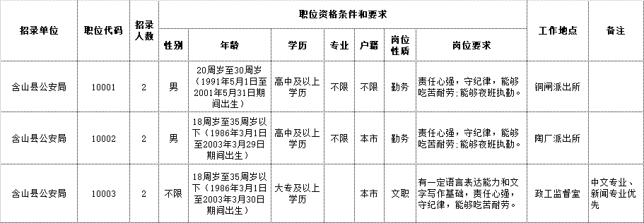 本次招聘警務(wù)輔助人員6名,具體職位見《馬鞍山市公安局含山片區(qū)招聘警務(wù)輔助人員職位表》(附件1)。