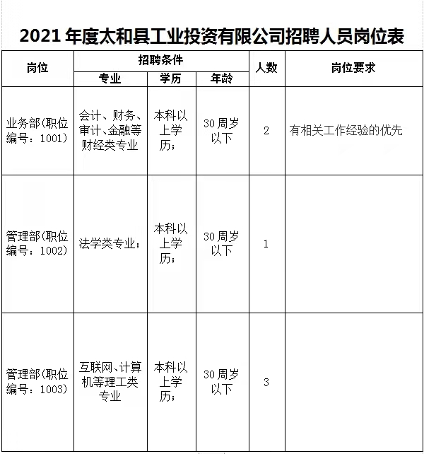 太和縣工業(yè)投資有限公司是經(jīng)太和縣人民政府批準(zhǔn),由太和縣國有資產(chǎn)管理局單獨(dú)出資設(shè)立的一家國有獨(dú)資公司。公司主營工業(yè)項(xiàng)目投資、助保金貸款、資產(chǎn)運(yùn)營、工業(yè)項(xiàng)目信息咨詢服務(wù)、基礎(chǔ)設(shè)施建設(shè)、棚戶區(qū)改造、農(nóng)村路網(wǎng)建設(shè)、農(nóng)業(yè)技術(shù)開發(fā)、污水處理等?,F(xiàn)根據(jù)公司業(yè)務(wù)發(fā)展需要,擬面向社會(huì)公開招聘6名工作人員,具體公告如下: