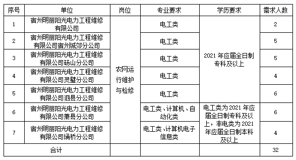宿州明麗陽(yáng)光電力維修工程有限責(zé)任公司(以下簡(jiǎn)稱公司)是國(guó)網(wǎng)宿州供電公司產(chǎn)業(yè)單位,主要受托開(kāi)展宿州地區(qū)所屬鄉(xiāng)鎮(zhèn)10千伏及以下配網(wǎng)設(shè)備現(xiàn)場(chǎng)巡檢維護(hù)、故障搶修,0.4千伏及以下客戶服務(wù)業(yè)務(wù)。根據(jù)公司發(fā)展需求,現(xiàn)面向社會(huì)公開(kāi)招聘。