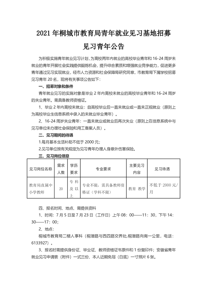 2021年安慶桐城市教育局青年就業(yè)見(jiàn)習(xí)基地招募見(jiàn)習(xí)青年公告