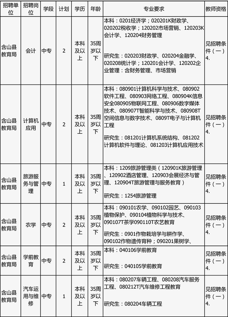 2021-07-21 17:54:50閱讀()含山縣人民政府根據(jù)《事業(yè)單位人事管理?xiàng)l例》(國務(wù)院令第652號(hào))、《事業(yè)單位公開招聘人員暫行規(guī)定》(原人事部令第6號(hào))和省委組織部、省人力資源和社會(huì)保障廳《關(guān)于印發(fā)〈安徽省事業(yè)單位公開招聘人員暫行辦法〉的通知》(皖人社發(fā)〔2010〕78號(hào))和中共安徽省委組織部、安徽省人力資源保障廳關(guān)于貫徹落實(shí)應(yīng)對(duì)新冠肺炎疫情影響做好事業(yè)單位公開招聘高校畢業(yè)生工作有關(guān)事項(xiàng)的通知》(皖人社秘〔2020〕73號(hào))規(guī)定和要求,落實(shí)中共含山縣委機(jī)構(gòu)編制委員會(huì)辦公室(含編辦函【2021】45號(hào))“關(guān)于同意縣電子工程學(xué)校緊缺專業(yè)教師引進(jìn)計(jì)劃的函”,現(xiàn)就含山電子工程學(xué)校2021年面向社會(huì)公開招聘專業(yè)課教師工作有關(guān)事項(xiàng)公告如下: