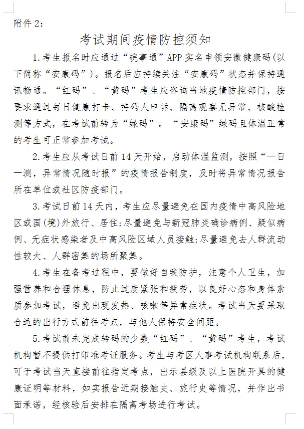 報(bào)考人員報(bào)名前,應(yīng)通過“皖事通”APP實(shí)名申領(lǐng)“安康碼”。報(bào)考人員報(bào)考前請認(rèn)真閱讀《考試期間疫情防控須知》(附件2)。報(bào)考人員提供的信息必須與本人實(shí)際情況、報(bào)考條件和所報(bào)考的崗位要求相一致。凡弄虛作假通過資格審查,其實(shí)際情況與報(bào)考條件規(guī)定不符的,一經(jīng)查實(shí),即取消考試、聘用等資格。