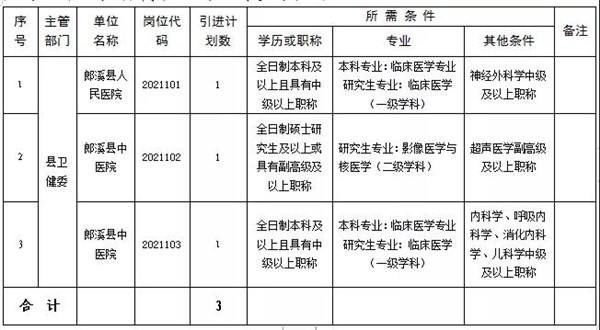 全縣縣級公立醫(yī)院共計劃引進(jìn)高層次、急需緊缺醫(yī)療技術(shù)人才3名,具體崗位、專業(yè)等要求如下: